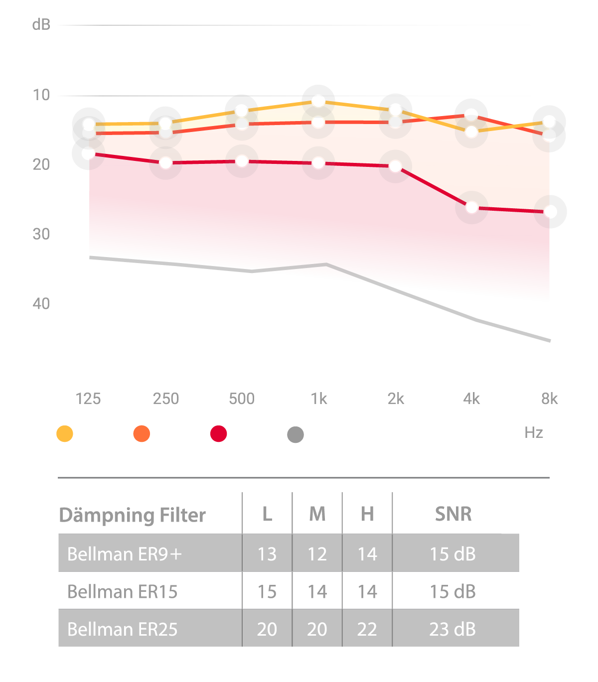 Medeldämpning i decibel för Bellman ER över olika frekvenser.